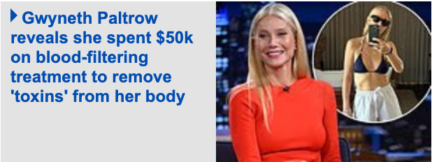 First of all, I feel we’re not talking enough about all the blood filtering currently going on. This is now the second headline I’ve seen about a famous person removing “toxins” from their body by cleansing their blood and I just feel nothing good is coming out of this. Although, Gwyn claims she “felt this immediate unburdening and clarity and lightness,” which sounds super legit and definitely real. I have not thoroughly investigated this procedure used to address the actor’s “chronic fatigue and brain fog,” but it feels like a new echelon of medical orthorexia has just been unlocked. Like isn’t the point of blood that, barring some legit autoimmune situation, it filters itself….. I don’t know. I just think something The Substance-y is going on here and we need to be interrogating rich people advertising $50,000 quack science much, much harder.