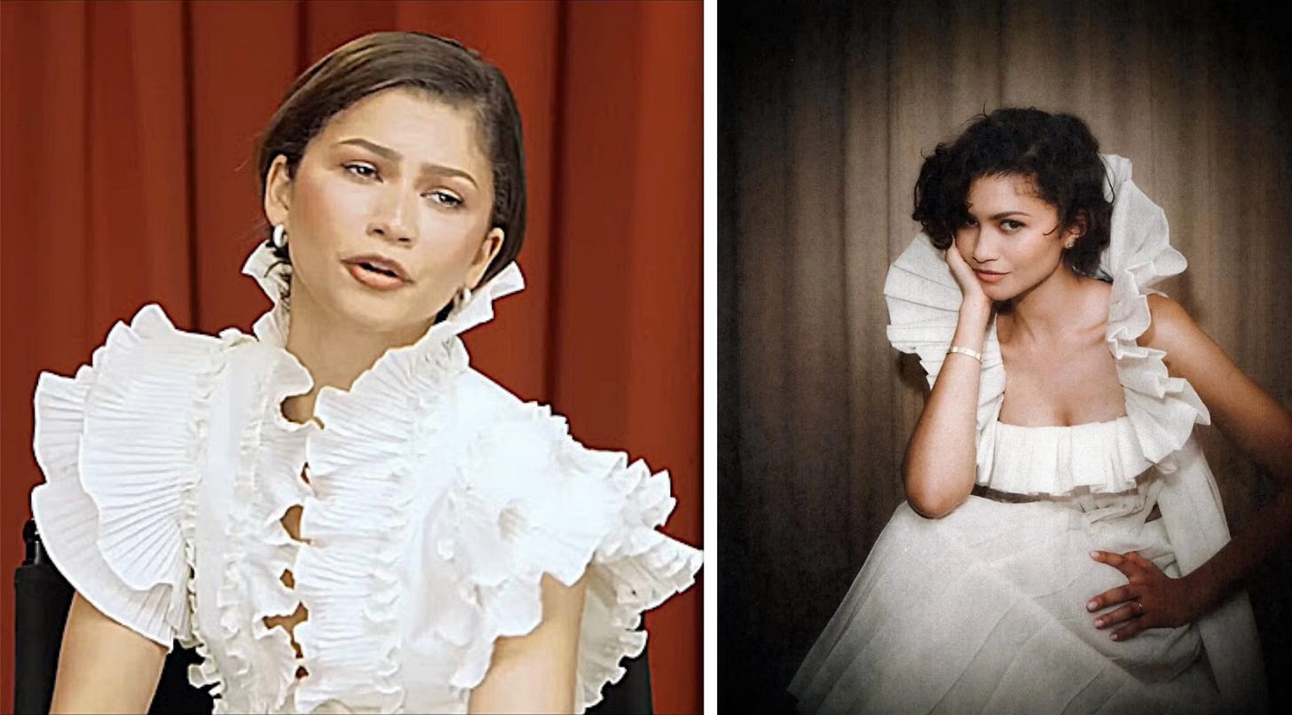 With the thrill of multi-million-dollar C-strings now behind us, I also just wanted to give you a little update on the state of the ruff by pointing out these two Zendaya fits. She’s been having an extremely flounce-heavy week, first in this Bluemarine Fall 2026 dress and then again more abstractly in custom Louis Vuitton. And both looks just got me thinking a bit more about this nape garnish and where it comes from.