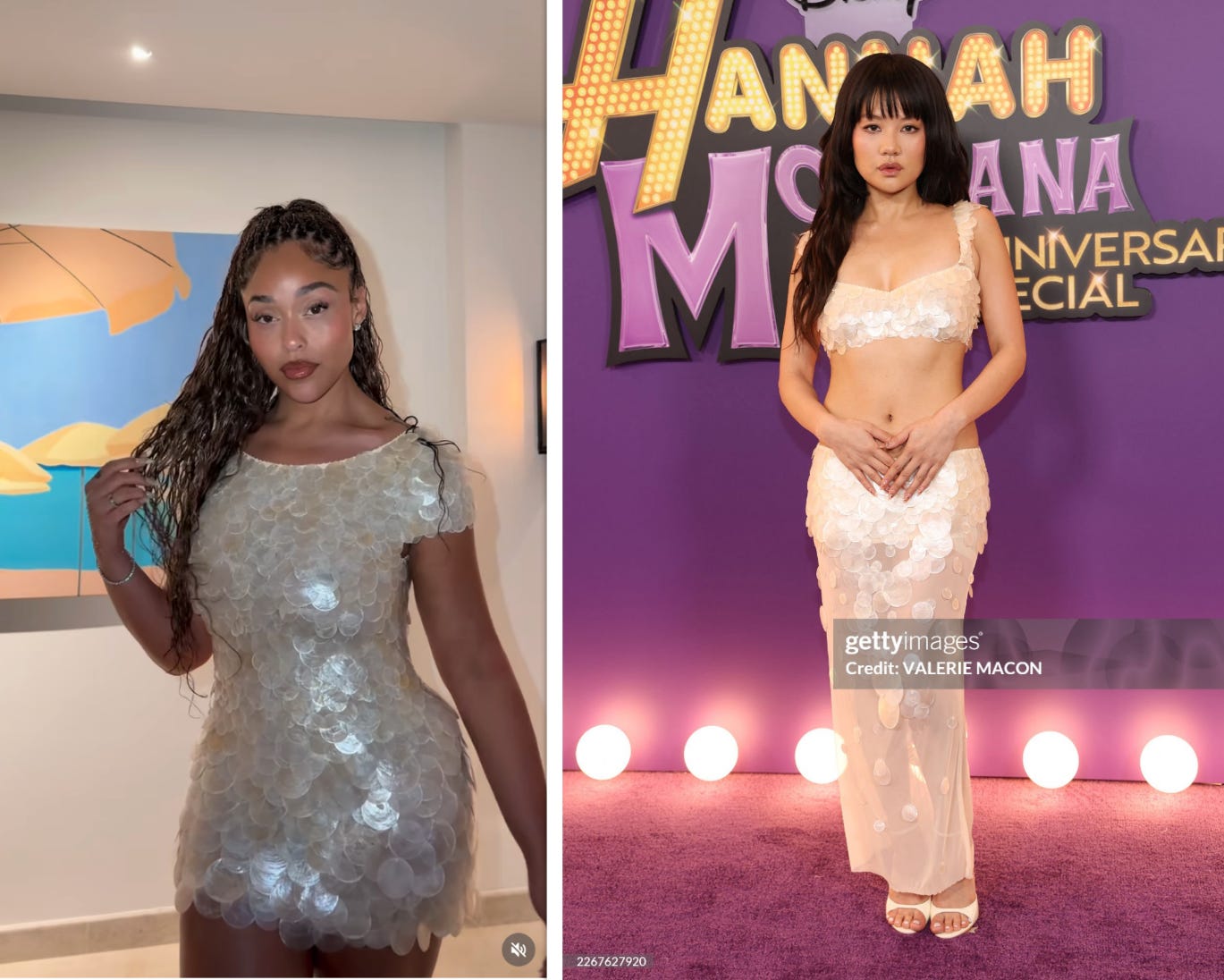 And the last thought I’ll leave you with is that I spotted the inklings of a new trend out there this week — dresses covered in iridescent discs which through extensive googling I have now learned are windowpane oyster shells! Rei Ami attended the Hannah Montana anniversary event in this pearlescent Datt set and Jordyn Woods wore a mini dress that appears to be by the same brand to her bachelorette party. Both are very mermaid DIY project just in time for summer and also very budget-friendly McQueen, which sounds shady but I mean with all beneficence in my heart. Mostly, I’m just pumped about this look taking off because I imagine that all those shells clacking and jangling about as these ladies move is quite loud and I’ve been gunning for outfits that incorporate the dimension of sound for a hot minute now.